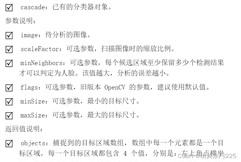 首先是加载级联分类器,OpenCV 通过 CascadeClassifier()方法创建了分类器对象,其语法如下:
