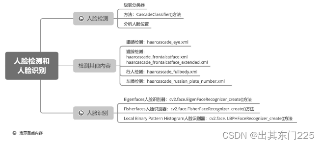 人脸检测和人脸识别是相辅相成的,这是因为在进行人脸识别前,要先判断当前图像内是否出现了人脸,这个判断过程需要由人脸检测完成。只有在当前图像内检测到人脸,才能判断出这张人脸属于哪个人,这个判断是由人脸识别器完成的。因此,人脸识别指的是程序先在图像内检测人脸,再识别这张人脸属于哪个人的过程。本章讲解了 3 种人脸识别器,读者要熟练掌握这 3 种人脸识别器的实现方法和实现原理。