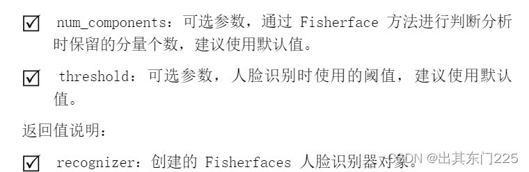 recognizer = cv2.face.FisherFaceRecognizer_create(num_components, threshold)