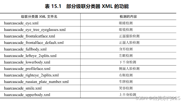 每一个 XML 文件都对应一种级联分类器,但有些级联分类器的功能是类似的(正面人脸识别分类器就有 3 个),表 15.1 是部分 XML 文件对应的功能,