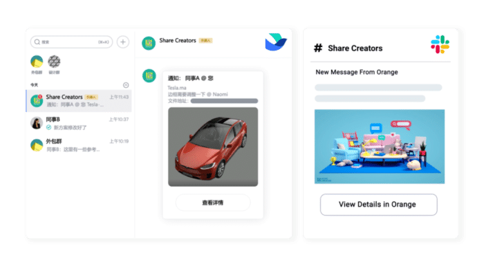 此外,Orange系统支持沟通工具API接口集成,像常用的飞书、钉钉、企业微信、Slack等办公沟通工具,都可以通过API集成到Orange中,用户可以通过Orange直接发送消息,无需重新添加好友/重新分组,团队整体沟通效率也得到了提升。