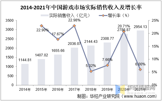 2014-2021年中国游戏市场实际销售收入及增长率