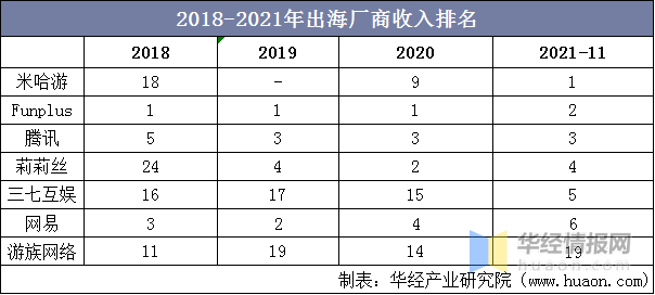 2018-2021年出海厂商收入排名