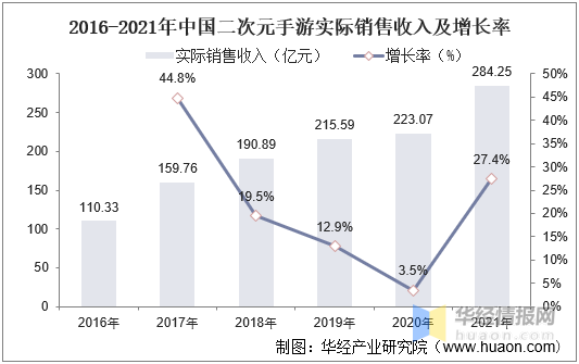 2016-2021年中国二次元手游实际销售收入及增长率