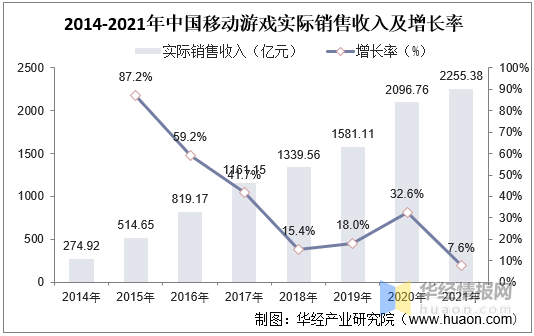 就我国移动游戏实际销售收入情况而言,2021年移动游戏整体市场新产品较少,主要增长来源于原游戏带来的收入,整体增长有限。根据游戏工委数据显示,2021年我国移动游戏实际销售收入为2255.38亿元,同比2020年增长7.6%,相较于2020年增速大幅度下降,主要原因是2020年疫情导致“宅经济”发展,人们在家中存在大量的休闲时间,导致移动游戏收入大幅度增长,随着疫情结束,企业逐步复工,市场恢复正常,增速回归正常。