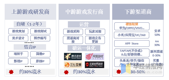 中国移动游戏产业链主要分为上游研发商、中游发行商和下游渠道商,流水分成占比分别约为30%、30%和30%-50%(IOS端30%/安卓端50%)。其中,渠道商掌握用户流量入口,流水分成比例和话语权最大;同时,为了节省中间成本、更好的掌握用户数据,越来越多的游戏企业向研运一体化方向发展。