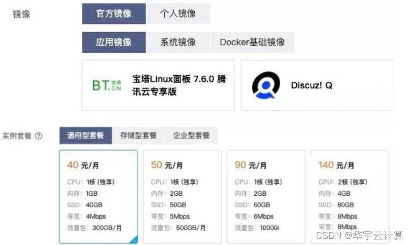 1、 应用环境(API参数 BlueprintId),交付形式上是镜像,包括应用镜像和系统镜像。其中应用镜像除了包含底层的操作系统外,还封装了应用软件、应用依赖的运行环境以及相关的初始化配置信息,如 LAMP、WordPress、Discuz! Q、ASP.NET、Node.js、BT-Panel 等,方便用户一键部署应用。