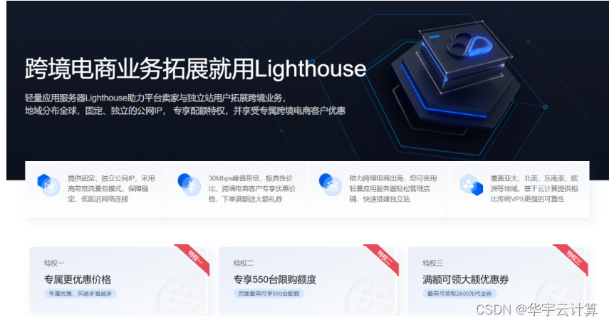 最后不得不提一下,轻量应用服务器发展至今,已经可以助力平台卖家与独立站用户拓展跨境业务,地域分布全球,固定、独立的公网IP, 专享配额特权,并享受专属跨境电商客户优惠。