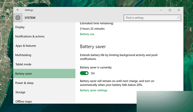 只有在不接通电源的情况下,Windows 10才能够激活“节电模式”,接通电源的情况下该特性自动屏蔽。默认情况下,设备电量剩余20%的时候,系统会自动激活“节电模式”,当然这个数字是可以自行设定的。同时用户也可以在“节电模式”下设定是否限制应用的后台通知推送功能,以及“节电模式”下是否使用屏幕最低亮度。