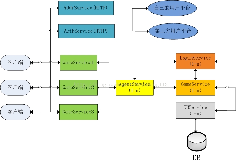 上图中1-n表示多个服务器,比如AgentService(1-n)表示多个AgentService。图中只包含服务端系统的基础必备节点,其他的什么充值服务、GM服务等等视具体业务需要的节点,这里就不一一列出了。下面依次对图中节点进行介绍。