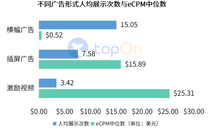 激励视频eCPM最高:作为最受欢迎的广告形式,但受制于玩家的主动点击,人均展示次数并不高。