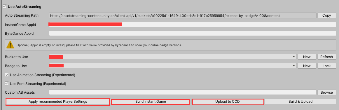 输入【instantGameAppid】 然后创建【bucket to use】 然后创建【Badge to Use】 打包快手需要选择【Use Animation Streaming】和【Use Font Streaming】,打包抖音不是必须