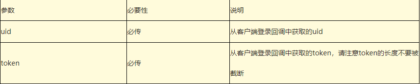 游戏客户端从SDK登录回调中获取到uid后,为防止用户篡改客户端而伪造用户uid标示从而登录他人账号,游戏客户端应将此信息传入给游戏服务器。游戏服务器调用此接口向SDK验证uid的真实性。若uid通过验证则允许此用户登录,若无法通过验证应拒绝此用户的登录授权。