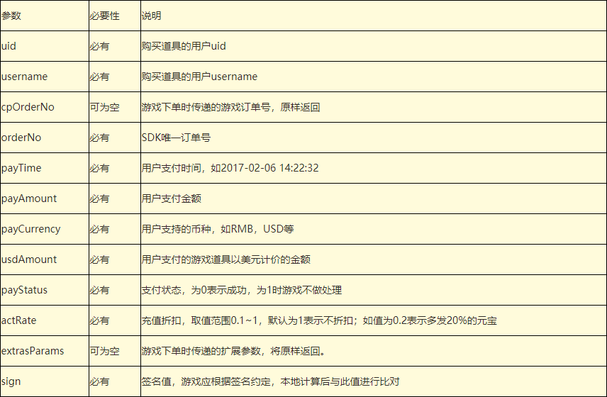 注:如果是官网充值方式时,CP可以获取extrasParams参数的值来定位到角色信息。这里的值CP可与第三方官网约定一个规则,让第三方官网按照规则传值。