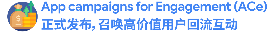 ACe 帮助广告主透过 Google 丰富的广告资源 (搜索、Play 商店、YouTube 及展示广告网络等) 渠道,定向召回已安装应用的用户,重返应用并促进其完成内购/下单等操作,从长线盈利角度帮助应用提高其用户的留存和生命周期价值。