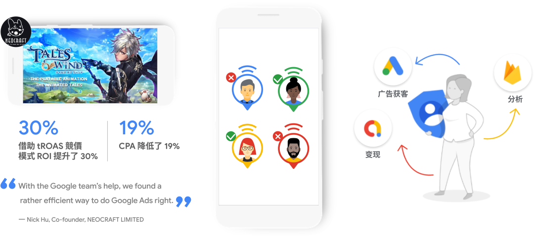 最快提速一倍机器学习时间,获 GA4F 加持,App campaigns 能以覆盖最有可能下载、并持续与应用互动的受众,更有效精确助力您的广告获取更多高价值用户,提升现有用户的存留转化,和简化投放受众的管理。解锁更多进阶功能,如: 投放时排除已下载或卸载用户;找到已转化指定事件用户的相似群体;tROAS (基于目标广告支出回报率出价) 方案等。您只需: