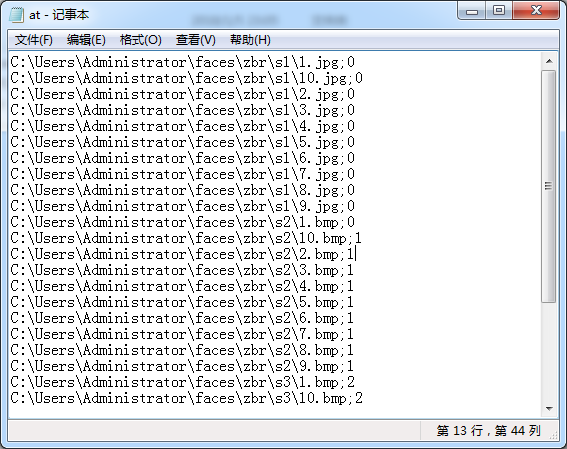 当我们写人脸模型的训练程序的时候,我们需要读取人脸和人脸对应的标签。直接在数据库中读取显然是低效的。所以我们用csv文件读取。csv文件中包含两方面的内容,一是每一张图片的位置所在,二是每一个人脸对应的标签,也就是每一个人编号。这个at.txt就是我们需要的csv文件。如图所示: