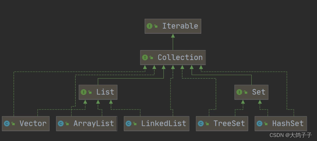 2.Collection接口有2个重要的子接口List,Set,他们的实现子类都是单列集合