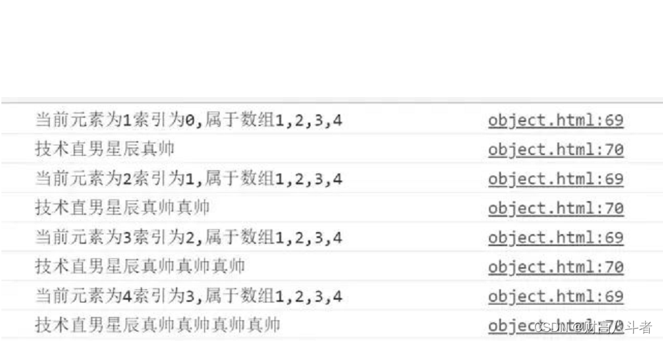 console.log(`当前元素为${self}索引为${index},属于数组${arr}`);