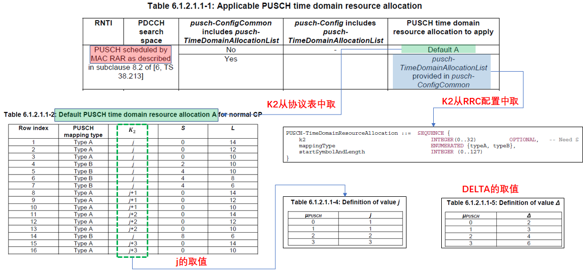 - K2:指PUSCH真正发送的slot和接收到上行调度的PDCCH所在slot之间的slot间隔