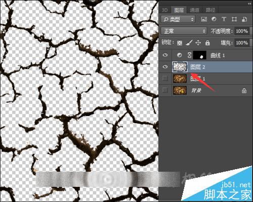 12、把图片中的裂纹全部选中之后,在英文输入法状态之下,按着键盘上面的ctrl+j键把作出的裂纹进行抠出。把下面两个图片前面的小眼睛关闭后,就可以看到现在提取到的裂纹素材。在保存的时候需要把它的格式存储为透明的png格式。就可以用到不同的软件中进行动画的制作。