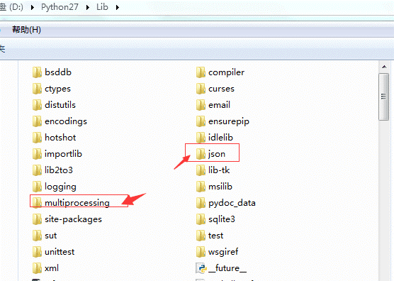 Json API 使用:python在版本2.6之前,是需要先下载包,安装后才能使用的,有点类似现在的RF内使用SeleniumLibrary一样。但是在2.6中,官方文档(https://docs.python.org/2.6/whatsnew/2.6.html)明显指出,“有一些重要的新的软件包添加到了标准库,比如multiprocessing 和json,但是跟python 3比,2.6的这些包不会引进更多的新功能。"于是安装python2.6以上版本的童鞋,可以不需要下载json包,直接在所需的地方就import json 即可使用,在安装目录下的Lib 下,看到这两个包(点进去仔细阅读这些源码,会有更多的收获,)如下文所示: