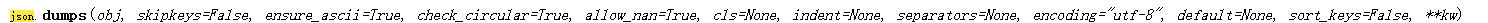 Skipkeys:默认值是False,如果dict的keys内的数据不是python的基本类型(str,unicode,int,long,float,bool,None),设置为False时,就会报TypeError的错误。此时设置成True,则会跳过这类key