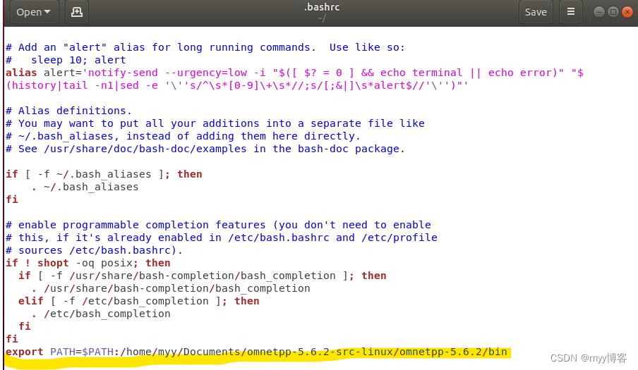 在出现的文件末尾添加一行指令(在下图中用黄色标出的部分)。其中 export PATH=$PATH: 后面是自己bin的路径(这里是我的,您可以在omnetpp+5.6.2/bin 文件夹下打开终端,输入pwd即可找到自己的路径,然后把它复制到export PATH=$PATH: 后面,然后保存)