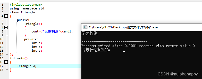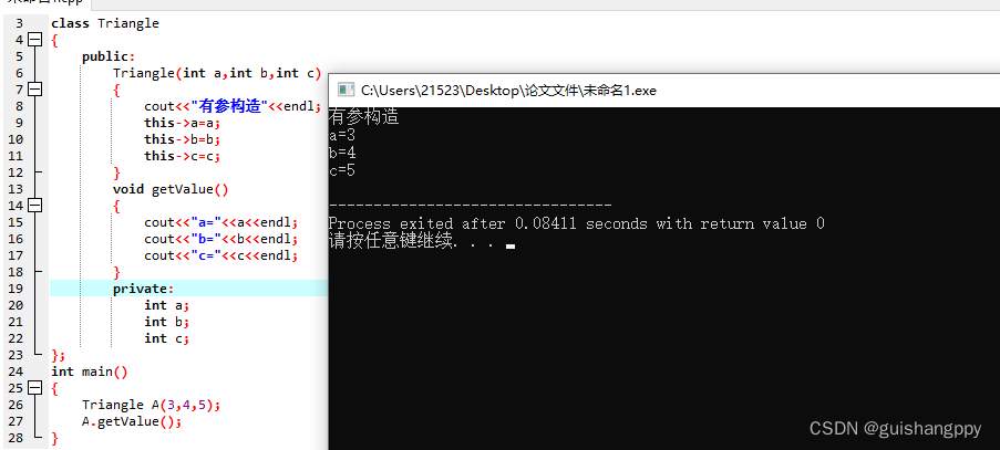 重点:以上述例子为例:什么被称为汽车呢,那应该是具有了汽车的特征,如四个轮子,一个 发动机,一个方向盘等等,所以我们之所以称它为一辆汽车,是因为它有了汽车的所有特征,如果少了轮子或者方向盘那么都不叫一个完整的汽车,对象亦是如此,我们定义了一个类去实例化一个对象时那么这个对象就应该有该类所应有的特征,所以构造函数的功能就是帮我们在实例化一个对象时能够自动的完成这个对象的初始化,例如我们在定义一个Triangle 类,那么一个三角形的特征是什么呢,或者说我们需要什么才能够描述出一个三角形呢,那就是三角形的三条边 a,b,c,所以我们定义的Triangle 这个类中就应该有三角形的三条边a,b,c,假如没有使用构造函数,那么我们实例化好一个对象后,该对象的成员数据a,b,c 都会是一个不确定的值,既然是不确定的值那么它就很有可能不是一个三角形,因为三角形的成立条件是a+b>c ,所以就不能称之为三角形,那么这个对象的实例化就失败了。所以构造函数就能解决这个问题。