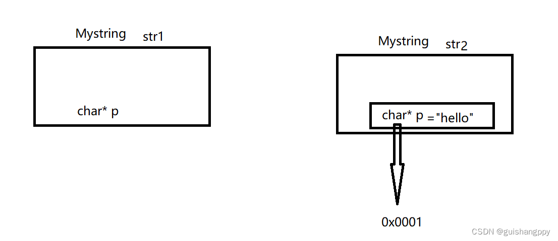 假如我们已经定义了一个Mystring类,类中有指针成员p,现在我们实例化了两个对象str1,str2,为对象str2指针初始化为" hello ",假设字符串" hello "的地址为0x0001,现在我们通过拷贝构造使用str2来初始化str1,会进行如下操作: