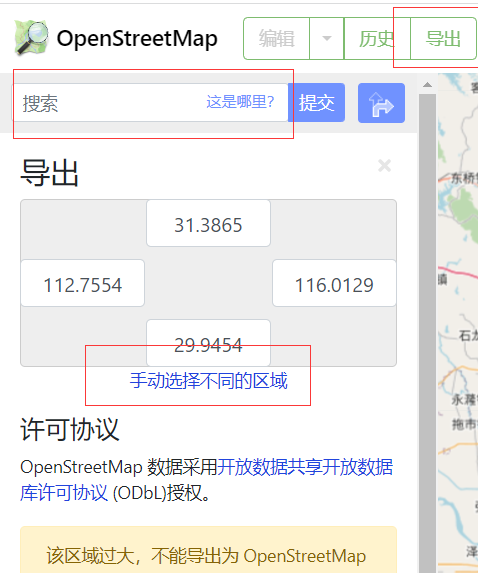 首先进入OpenStreetMap官网,在左上角可以搜索需要选择的区域。在选定以后点击导出->手动选择不同的区域->导出。就可以将选中的区域下载,下载后的文件为.osm,下载后将其放入project文件夹中。(我下载的文件将其命名为csu.osm)