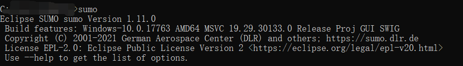 %SUMO_HOME%bin在完成环境变量添加以后,可以在cmd中查看sumo的安装版本。打开cmd,输入sumo可得到以下内容: