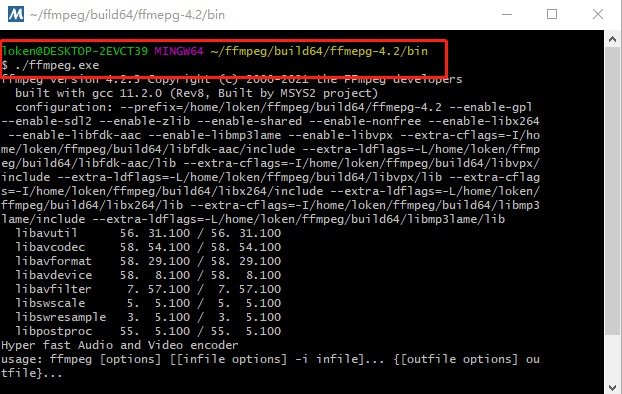 可以看到 ffmpeg.exe 已经编译出来了。这个时候 在MSYS2 仿真linux命令行里,ffmpeg.exe 是可以运行的。如图。