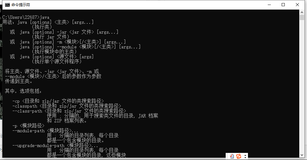 在cmd中分别输入java,java -version(jdk版本号),javac(编译命令)后的界面分别如下,这就代表成功了