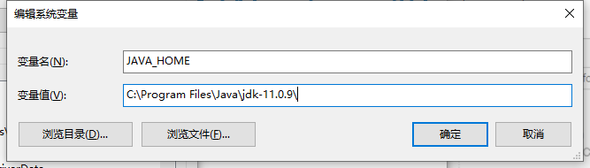 变量值:jdk安装的目录,我们这里就是 C:Program FilesJavajdk-11.0.9