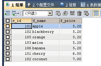 第一个查询把f_price小于9.0的记录查询出来,第二个查询把s_id为101和103的记录查询处理