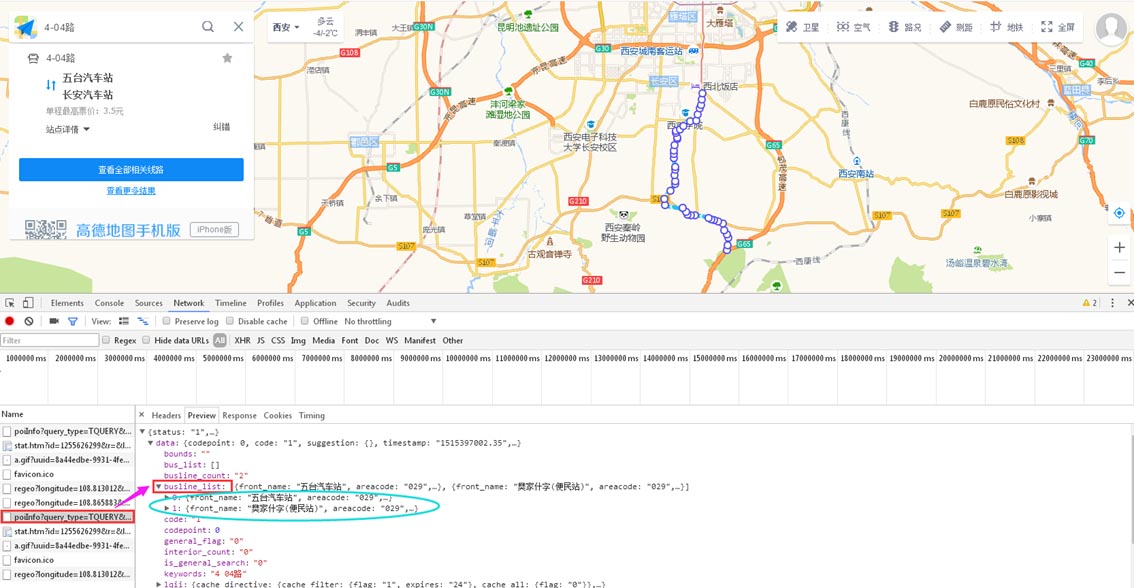 地图API可以,那么通过地图抓包呢?打开某图主页,直接输入某市公交名称,通过抓包,成功找到站点和线路信息。具体抓包信息如下图所示,busline_list中详细列出了站点和线路的信息,其中有两条,是同一趟公交不同方向的数据,略有差别,需注意。找到入口过后,接下来爬虫就要大显身手了。