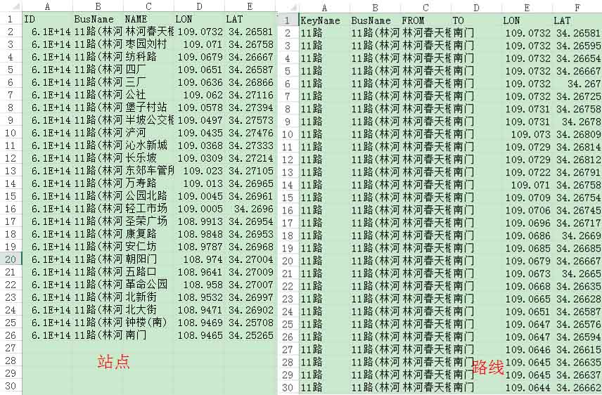 以下是某一条公交站点和线路的处理后的数据展示。由于不同的地图商采用不同的坐标系,会有不同程度的偏差,需要坐标纠偏。下一步,博主将详细介绍如何批量将这些站点和坐标进行坐标纠正和矢量化。