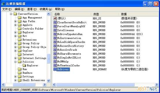 首先,我们打开注册表编辑器,依次展开如下分支[HKEY_CURRENT_USER/software/Microsoft/windows/CurrentVersion/Policies/Explorer],新建二进制值“NoDrives”,其缺省值均是00000000,表示不隐藏任何驱动器。键值由四个字节组成,每个字节的每一位(bit)对应从A:到Z:的一个盘,当相应位为1时,“我的电脑”中相应的驱动器就被隐藏了。第一个字节代表从A到H的8个盘,即01为A,02为B,04为C……依次类推,第二个字节代表I到P,第三个字节代表Q到X,第四个字节代表Y和Z。比如要关闭C盘,将键值改为04000000;要关闭D盘,则改为08000000,若要关闭C盘和D盘,则改为0C000000(C是十六进制,转成十进制就是12)。