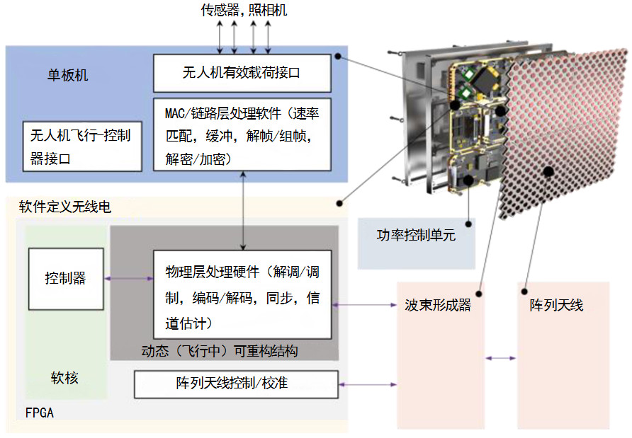 无人机通信硬件设计是多个相关方面权衡的结果,一般受以下优化标准影响:SWaP-C要素、瞬时带宽、距离(与可用射频功率、接收机灵敏度和天线增益密切相关、链路可靠性、完整性和连续性。不是所有标准都直接适用于控制和非有效载荷通信,可采用利用多部高性能软件无线电和相控阵天线的最先进硬件架构。