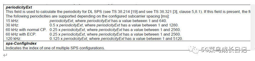 在R16中,为了减小时延,SPS-Config中的periodicity的最小值没有发生改变,但是增加了一个field periodicityExt-r16,该值的取值最小值为1,单位为Slot。