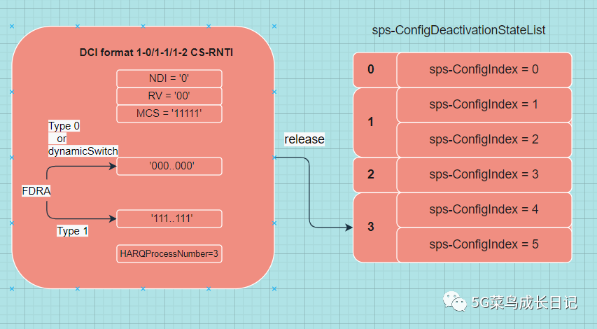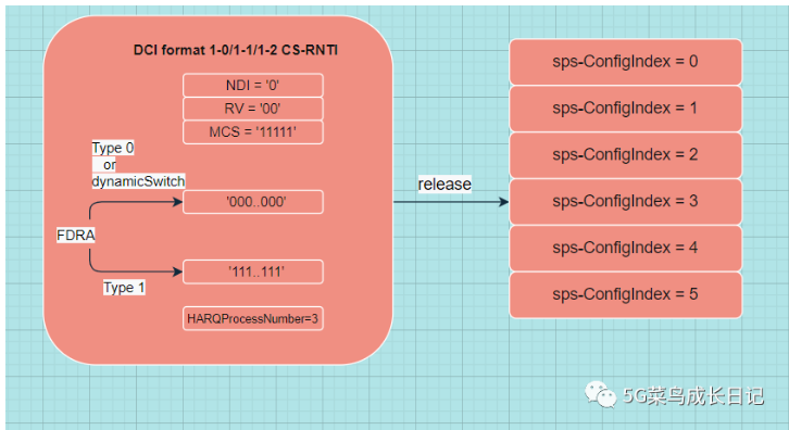 但是释放SPS-Config,除了和R15中的一个DCI释放一个SPS-Config外,还可以通过相关配置,通过一个DCI来释放多个SPS-Config。