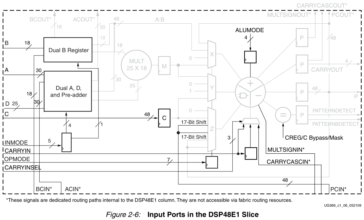 每个DSP48E1片还具有两个级联输入路径(ACIN和BCIN),在相邻的DSP48E1切片之间提供级联输入流。级联路径对于A输入是30位宽,对于B输入是18位宽。受益于该特性的应用包括FIR滤波器、复杂乘法、多精度乘法和复杂的MACCs。