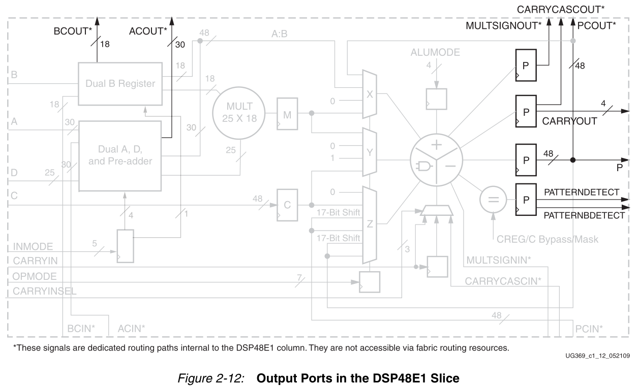 每个DSP48E1片都有一个48位的输出端口p。这个输出可以通过PCOUT路径内部连接(级联连接)到相邻的DSP48E1片。PCOUT连接到相邻的DSP48E1片中的Z多路复用器(PCIN)的输入。此路径提供相邻DSP48E1片之间的输出级联流。
