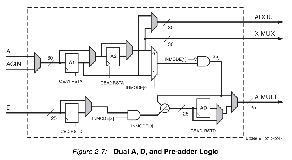 INMODE[3]提供预加法器减控制,其中INMODE[3] = 1表示减,INMODE[3] = 0表示加。