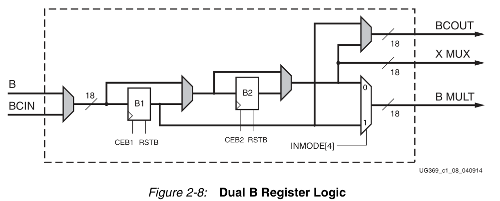 INMODE[4]选择乘数B端口,其中BREG=1 or 2,INMODE[4] = 1:选择B1,INMODE[4] = 0:选择B2。