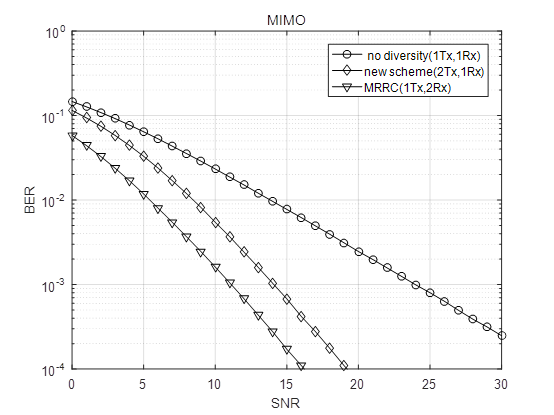 legend(' no diversity(1Tx,1Rx)', 'new scheme(2Tx,1Rx)','MRRC(1Tx,2Rx)')