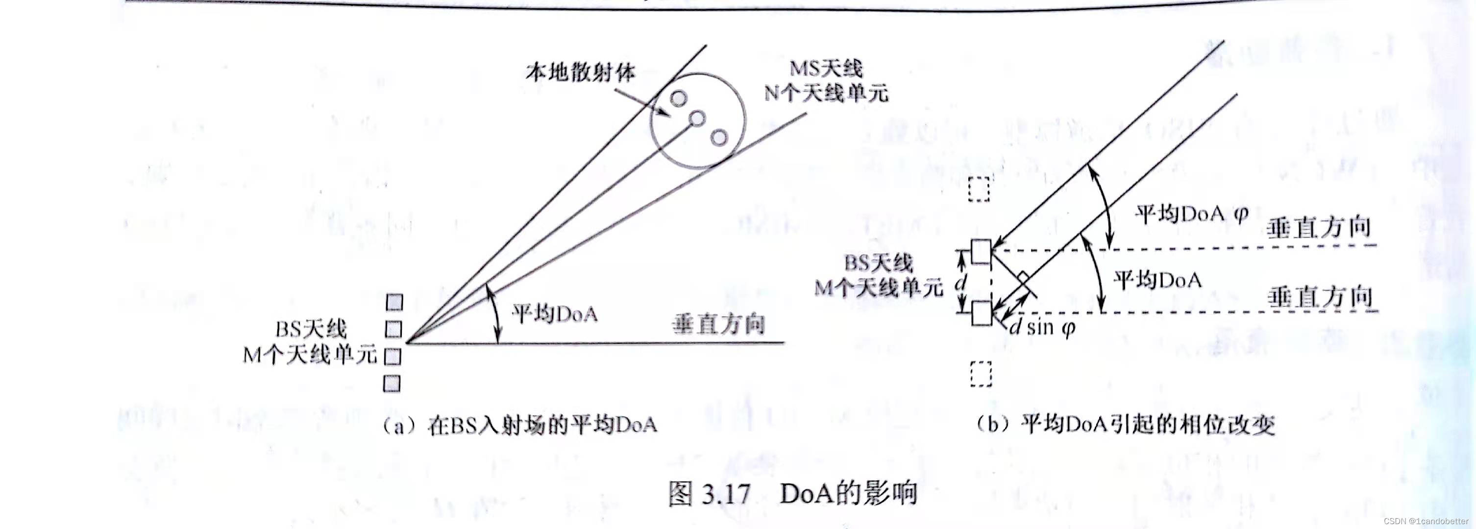 AOA为每个独立的多径分量的到达角,而平均DOA(到达方向,用表示)是指这些AOA的均值.当DOA不等于0时 ,入射场的平均DOA与天线阵列的垂直方向不一致,天线辐射图将导致两个相邻天线单元的相位差为