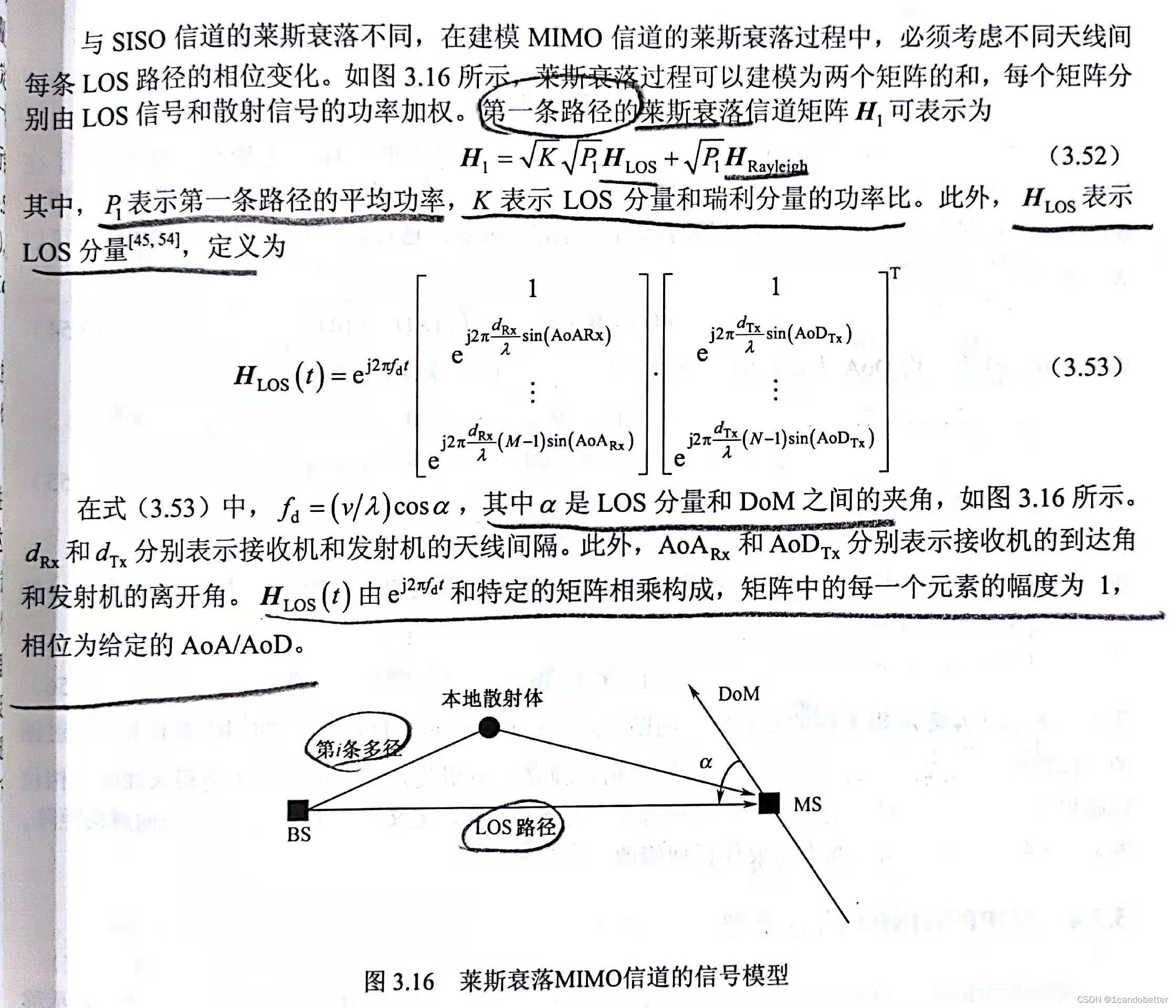 与SISO信道的莱斯衰落不同,在建模MIMO系电脑的莱斯衰落的过程中,必须考虑不同天线间每条LOS路径的相位变化.莱斯衰落可以建模为两个矩阵的和,每个矩阵分别由LOS信号和散射信号的功率加权.