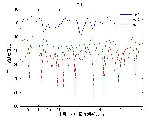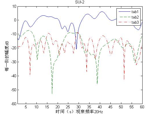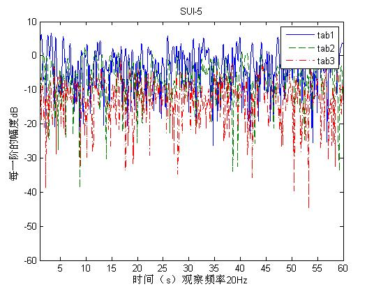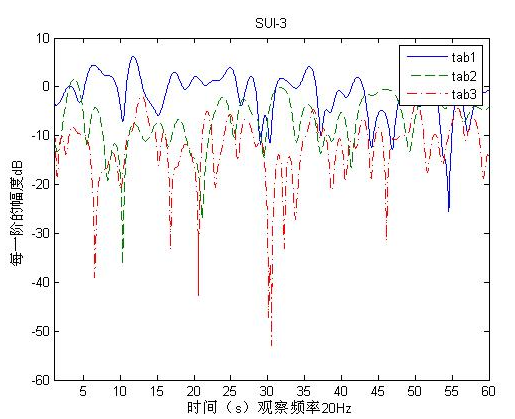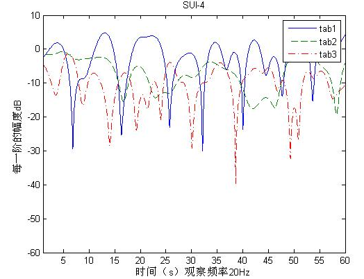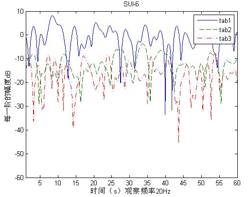 多径信道:我们仿真的3径信道由不相关的3个Rayleigh随机变量通过以上的调整,并经过不同的时延后叠加,最终模拟了SUI的信道模型。